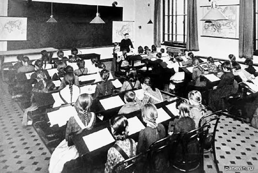 Представьте меня лет на 10-15 помоложе, вот так примерно выглядела тогда Александра Васильевна. На ней всегда было длинное темное платье с высоким воротником стоечкой, которое делало ее чуть выше, чем она была на самом деле. Темно-русые волосы были гладко зачесаны назад и закручены сзади в узел. Тогда во время войны под лазарет была отдана лишь часть Народного дома, а в оставшихся помещениях не прекращали работать школьные классы и ремесленные мастерские, расположенные в полуподвальной части, где старшие школьники обучались разным профессиям, работали и вечерние классы для взрослых.