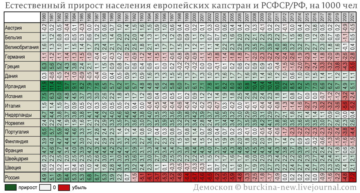 Из таблички понятно, что именно Россия после 1991 года является лидером по вымиранию населения, а Европа в целом упала в минус только недавно и это при том, что враньем о вымирании Европы российского обывателя кормят уже лет 15-20.