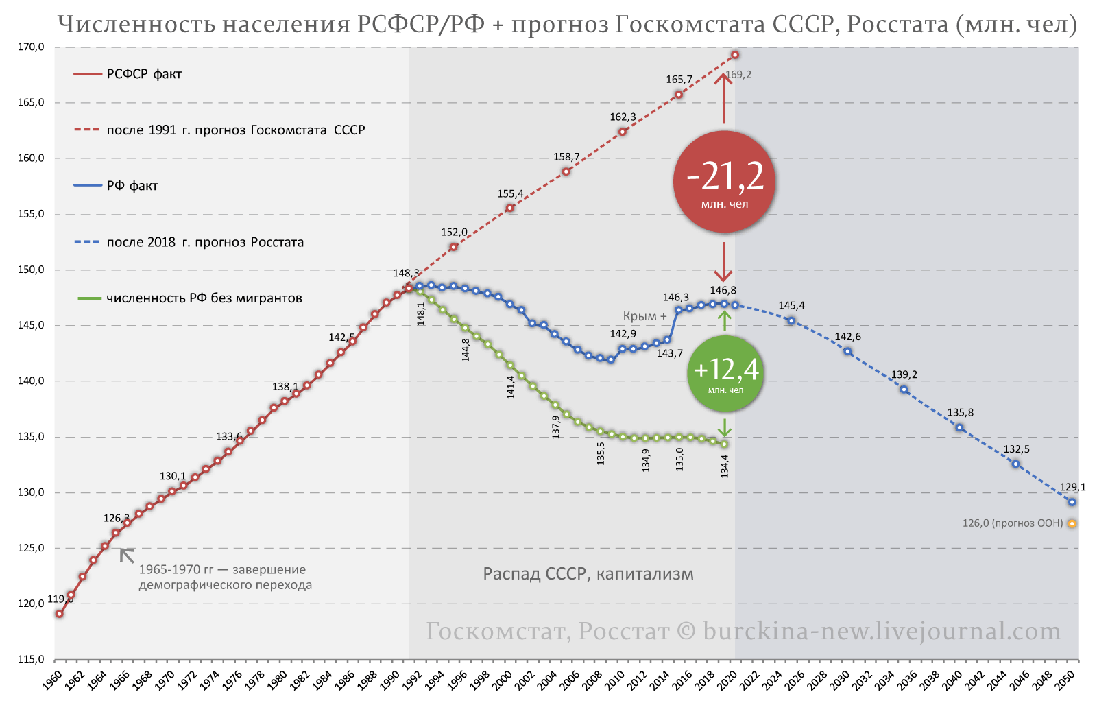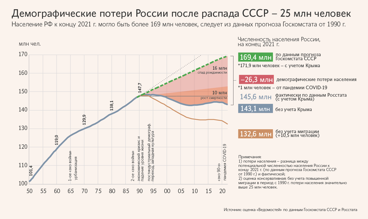 То есть НЕ будь событий 1991 года, то нас сейчас было бы порядка 170 миллионов человек вместо нынешних 145,5.