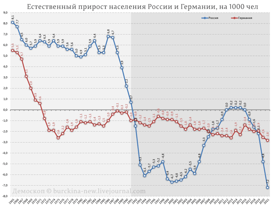 Если капиталистическая ФРГ в отличии от социалистической ГДР начала вымирать еще в начале 70-х годов, то Россия ее резко обогнала после 1991 года после того, как нам силой и обманом навязали капиталистический путь деградации и вымирания вместо социалистического пути развития и дальнейшего роста населения.