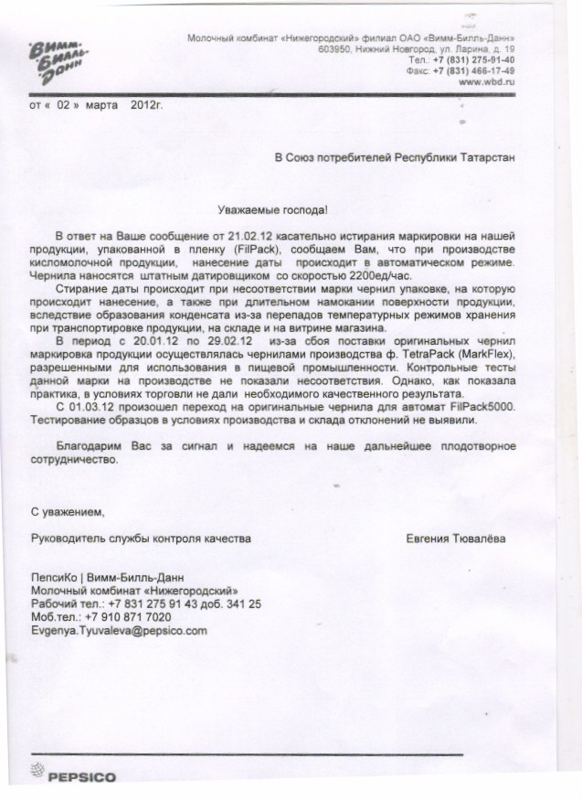 Руководитель службы контроля качества Молочного комбината «Нижегородский» филиала ОАО «Вимм-Билль-Данн», по поводу нарушения правил маркировки упаковки кисломолочной продукции «Вимм -Билль-Данн», сообщил в Союз потребителей РТ, следующее: маркировка осуществлялась не оригинальными чернилами, вследствие чего происходило истирание даты выработки. Как сообщается в письме с 1 марта 2012г. завод снова перешел на маркировку продукции оригинальными чернилами для автомата FiLPack5000.