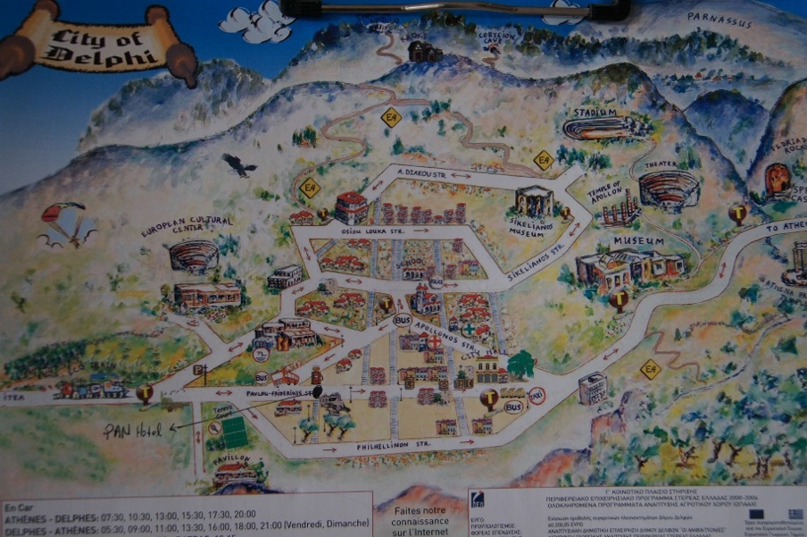 Внизу карты Дельф расписание автобусов до Афин и обратно.