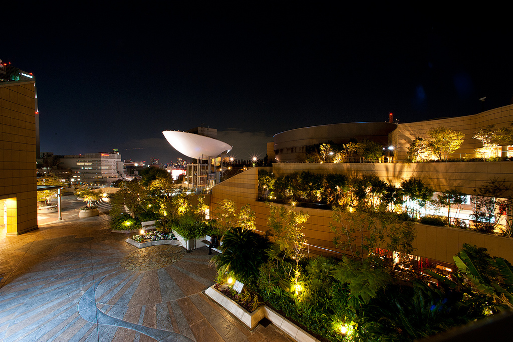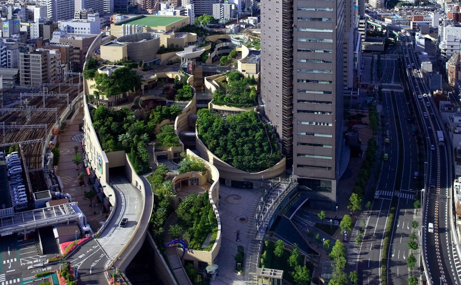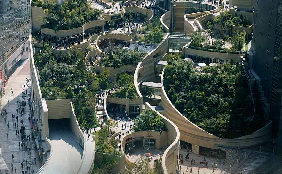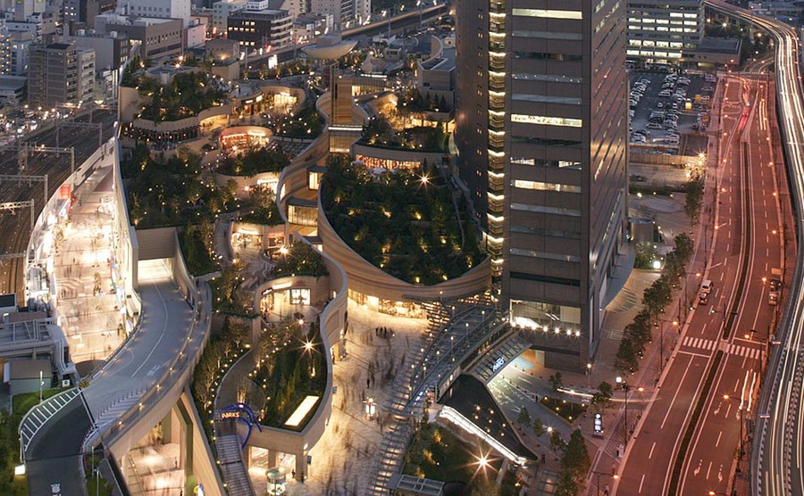 В мегаполисе каждый отрезок “зеленой” земли имеет огромную ценность. До 2003-го на этом месте в Осаке был бейсбольный стадион. Сейчас здесь построен 30-ти этажный комплекс, Парковые Башни (Parks Tower), где восемь этажей занимают террасные сады, Намба Парки (Namba Parks). Парк выходит на улицу, приглашая проходящих мимо людей отдохнуть в его свежести и красоте, среди деревьев, скал, лужаек, потоков воды, прудов и водопадов.