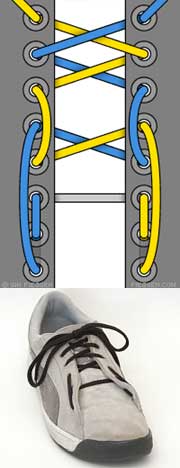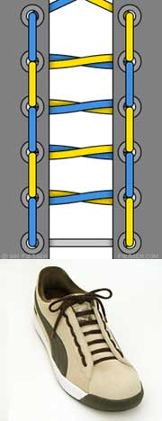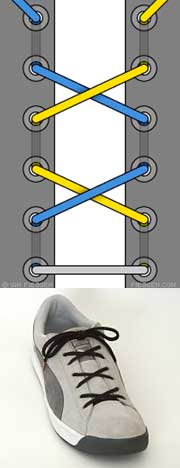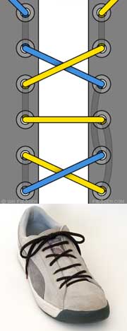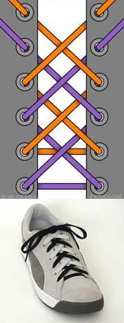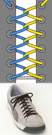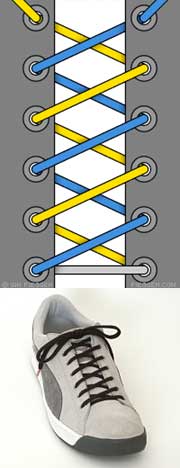 Шнурок пропускается через нижние дырки и выводится наружу с обоих концов. Концы пересекаются, а затем пропускаются изнутри наружу через отверстия. Доходите до верхних дырочек и завязываете шнурки. Этот метод лёгок и удобен; сминает ботинок, а не ногу.