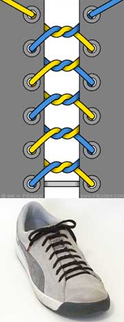 Добавочный узел на каждом шаге шнуровки увеличивает её прочность и улучшает внешний вид. Способ идеален для шнуровки лыжных ботинок, роликов и т.д. Ослабить шнуровку очень проблематично.