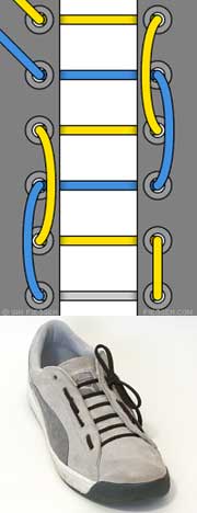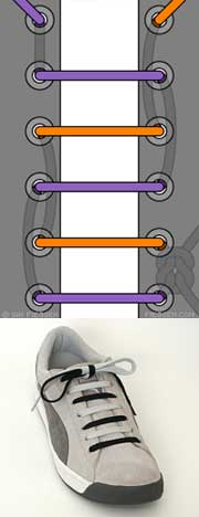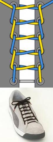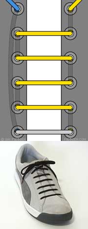Очень похож на предыдущий метод, только на изнанке шнурки идут не по диагонали, а прямо. Этот способ шнуровки подходит только для тонких или плоских шнурков, потому что шнурки проходят через дырочки дважды. Именно поэтому шнуровка очень прочная, однако её сложно затянуть.