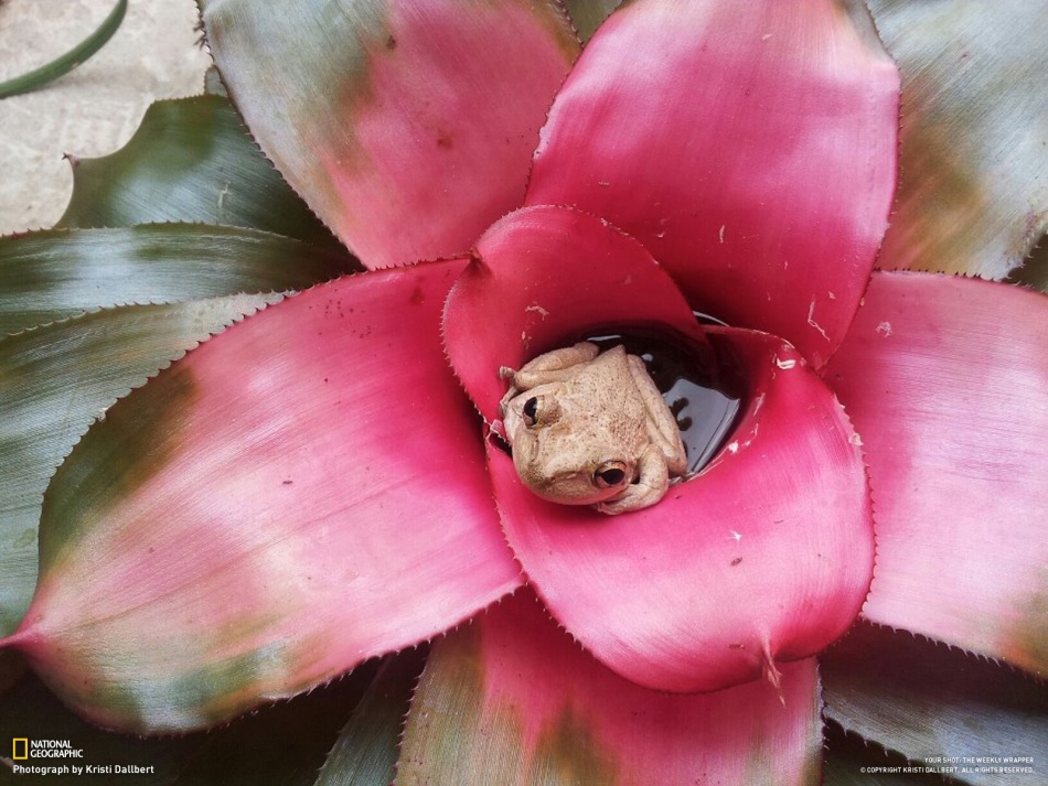 Древесная лягушка сидит в цветке бромелии. (Kristi Dallbert)