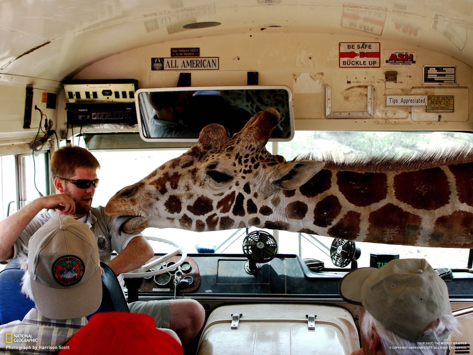 Сцена в автобусе, на котором посетители парка диких животных “Из Африки” в Аризоне, передвигаются по его территории. Жираф на минутку заглянул к своему приятелю-водителю. (Harrison Scott)