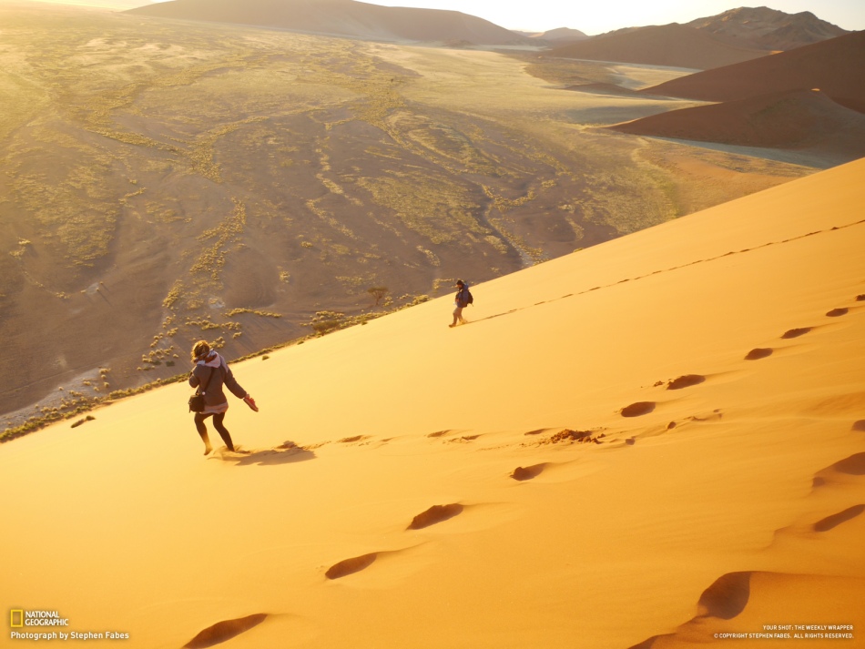 Пара спускается вниз с "Дюны 45" на восходе солнца в пустыне Намиб, Намибия. (Stephen Fabes)
