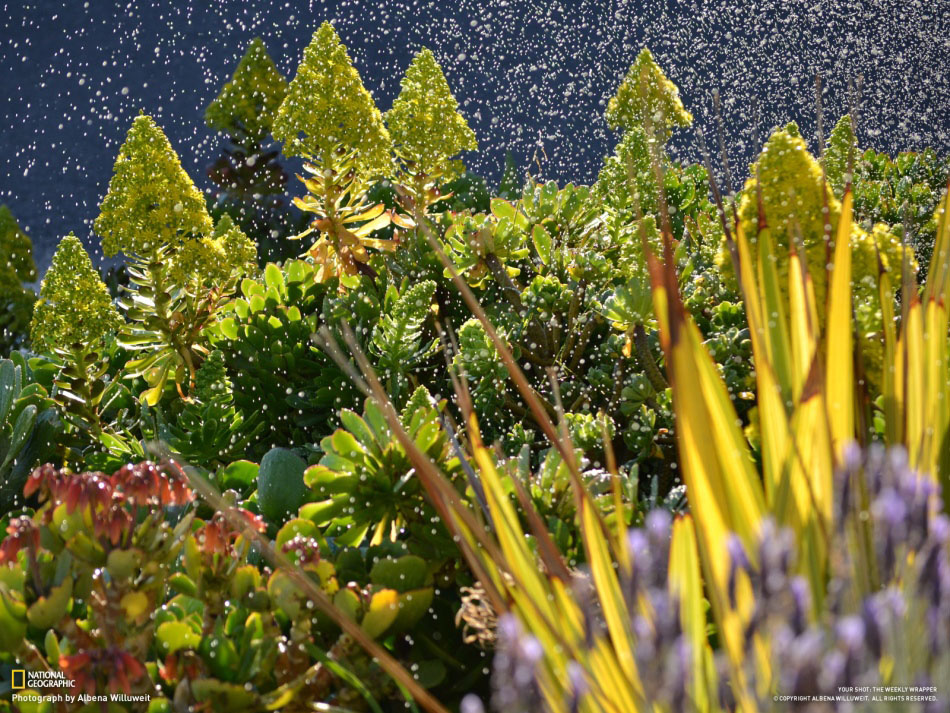 Сад во дворе дома во время включения автоматической поливалки. (Albena Willuweit)