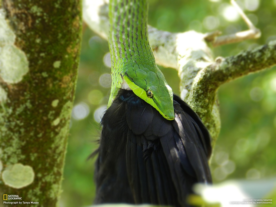 Зеленая змея глотает ани - американскую птицу семейства кукушковых. Белиз, Центральная Америка. (Tanya Musso)