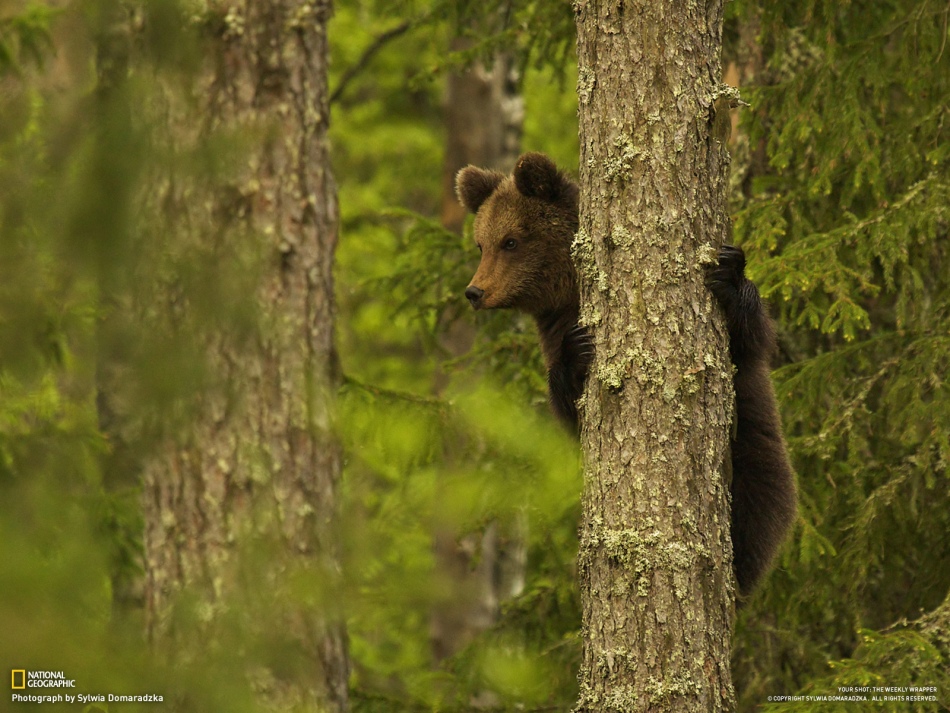Медвежонок прячется на дереве при виде старого медведя-чужака. Медведицы обучают своих детей залезать на деревья в случае опасности. (Sylwia Domaradzka)