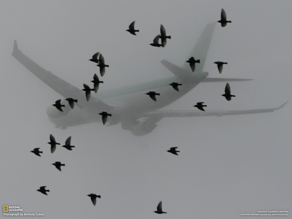 Птицы летят в пасмурный день на фоне взлетающего самолета. Дублин, Ирландия. (Anthony Cullen)