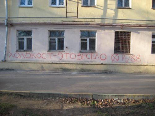 Несколько дней назад на фасаде нехорошего дома №66 по проспекту Ленина в Нижнем Новгороде краской написали лозунг "Холокост - это весело". Рядом с надписью были цифры 14/88 - кодовый девиз у белых националистов. Число 14 означает - «Мы должны защитить само существование нашего народа и будущее для белых детей». А 88 - является закодированным приветствием «Heil Hitler!».