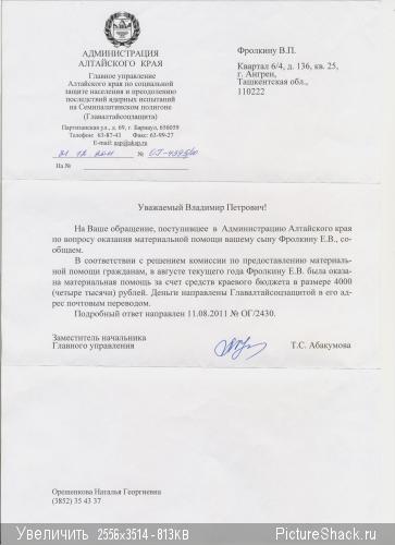 Обратилсяк губернаторуКарлину по интернету – ответ «на общих основаниях». Обратились в Кабинет Министров России по интернету – письмо передано в прокуратуру Барнаула и в Глав. Упр. преодолению последствий на Семипалатинском полигоне (Оттуда нам уже приходил ответ на запрос губернатору – «на общих основаниях…») Секретариат Губернатора Края 12.12.2011 № 9643-14/