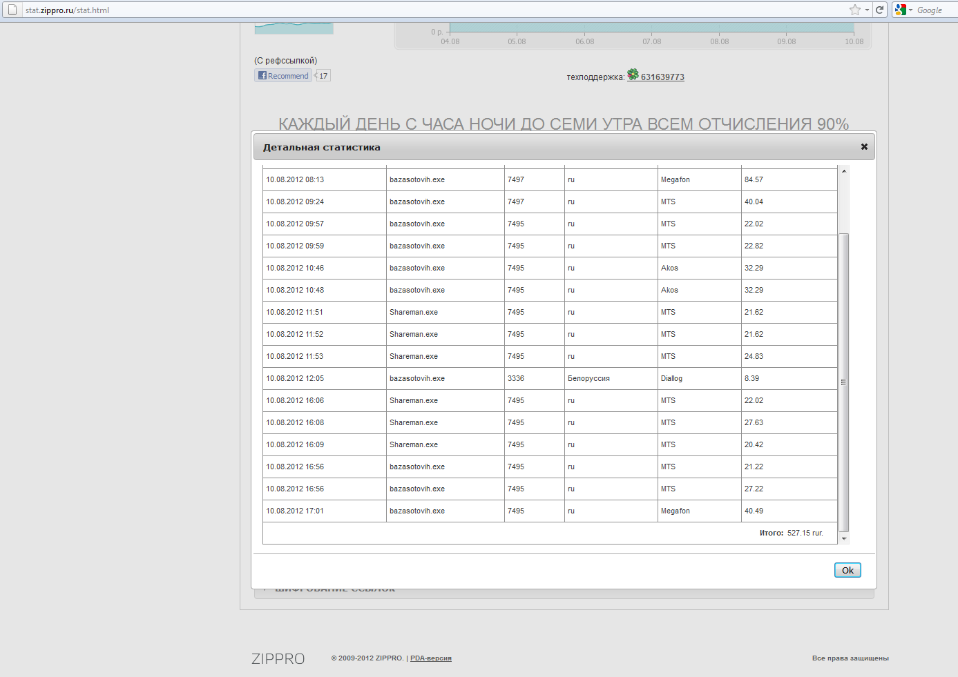 Из таблиц, представленных выше, видно, что «партнеры» ZIPPRO уж точно не бедствовали. Однако, как часто это случается в России, в погоне за высокими прибылями владельцы сервиса и партнерской сети пошли еще дальше. За спиной у своих «партнеров» они решили получить доход с установки и более серьезных вредоносных программ. На данный момент всем пользователям, которые имели неосторожность скачать любой архив Trojan.SMSSend , кроме уже гарантированного тулбара от Mail.Ru, установят еще и Trojan.Mayachok.1. А «партнеры» собственными руками создают офлайн-ботнет для ZIPPRO.