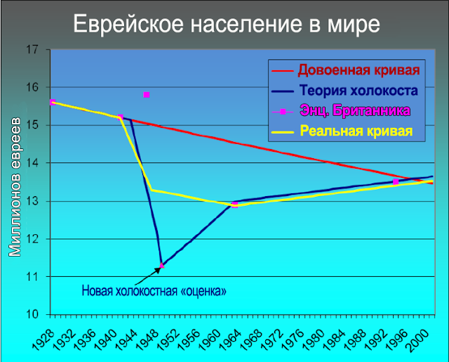 На синей линии (выведена согласно еврейской версии холокоста) заметно невероятное явление: во время войны, резкое падение более чем на 4 миллиона ("холокост"), а затем резкое увеличение до 1964 года и с тех пор рост со стабильным темпом.