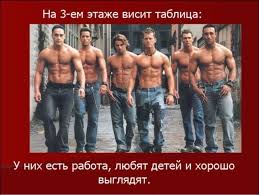 Вывеска на третьем этаже: "Мужчины, имеющие работу, любящие детей и необычайно красивые". "Ух ты! " - подумала женщина, но все же пошла на четвертый этаж.