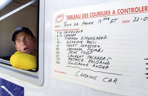 Лэнс Армстронг выглядывает из кабинки допинг-контроля во время «Тур де Франс». Фото: Reuters