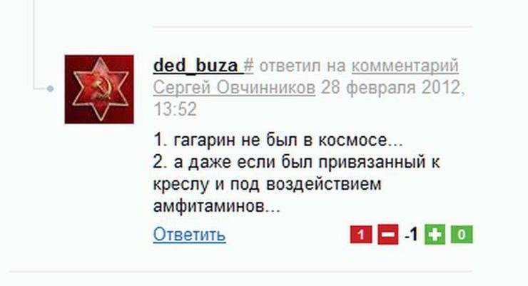 Чего же стоила Российскому народу космическая программа? Миллионы погибших в ГУЛАГАХ и шарашках, уничтожение Российской элиты, миллионы и миллиарды пущенных на воздух денег - все это цена диктаторских амбиций Сталина. Мы призываем вас бороться против культов личности Гагарина и Сталина, присоединиться к "дегагаринизации"! Заставим нынешних ученых покаяться за миллионы запущенных в космос лично Сталиным, захороним рабский менталитет и имперские амбиции, ибо так сказал Вутин.