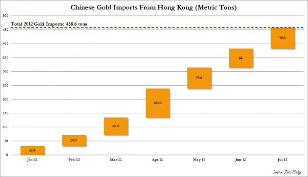 Китай через Гонконг скупил 458,6 тн золота за 7 мес 2012