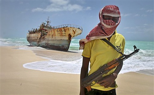 Сомалийский пират Абди Али рядом с тайваньским рыболовным судном, которое выбросило на берег после того, как пираты получили выкуп и освободили экипаж, Сомали.