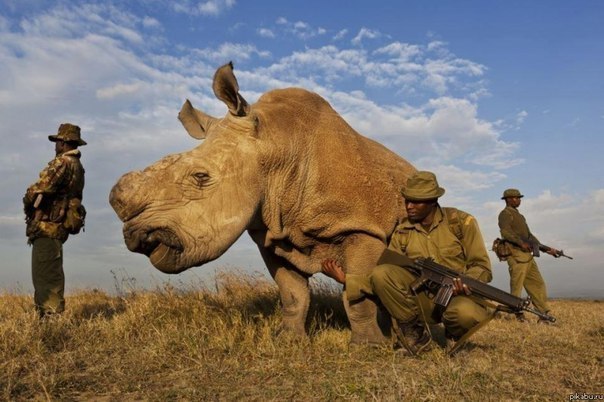 Белый носорог, которых в мире осталось всего 4 особи, бродит в окружении вооружённых телохранителей.