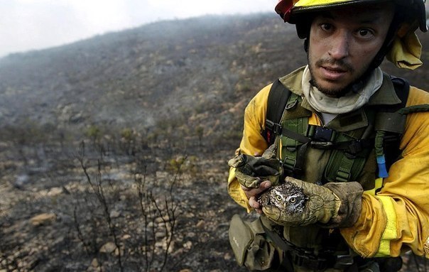 Пожарный несет совенка, спасенного во время лесного пожара в Валенсии: