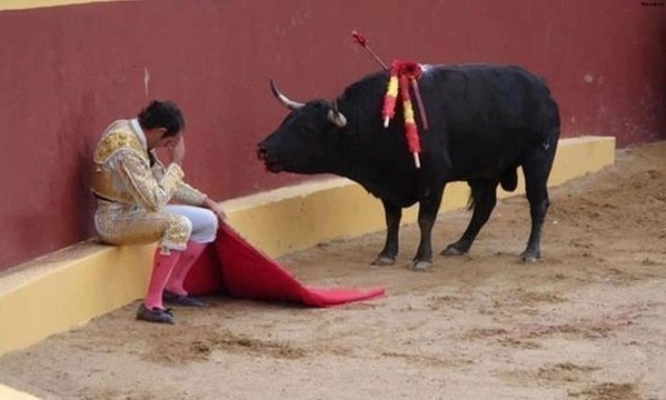 Это удивительное фото знаменует собой завершение карьеры знаменитого матадора Альваро Мунеро. Он упал в раскаянии прямо в ходе боя, когда увидел, что зверь совсем не хочет с ним бороться.