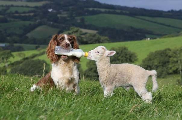 Кокер-спаниель кормит маленького ягненка молоком из специальной бутылки.