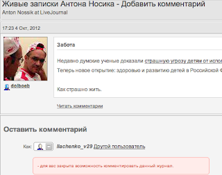 и на втором экране (в ЖЖ) в это же время получаю Бан от носика -долбоеба (официальноного лица ЖЖ.RU) наверно это великая честь ибо персонально он отпустился до грязной работы впервые за полтора года знакомства (он у меня был можно сказать "первым" об этом будет в узловой статье "Социальные сети Кем ? Для Чего? и хто тама ")В современном мире с учетом затрат на сложно организованную пропаганду, переубедить кого то, что Мы стоим на голове, а ходим с "помощью ушей", практически не решаемая задача , но пусть и очень трудно, можно найти тех кто понимает происходящее и чем это всем грозит.