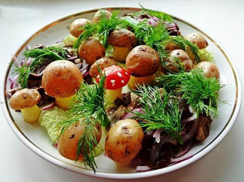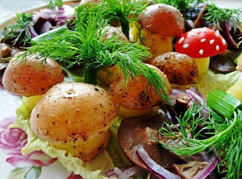 А дальше включаем фантазию и расставляем картофельные грибы на «полянке»