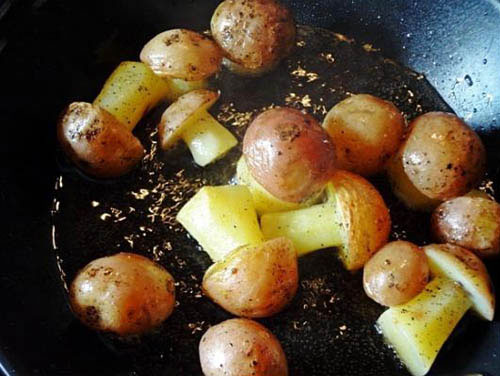Разогреваем масло на сковороде и обжариваем картофельные грибы на не сильном огне: