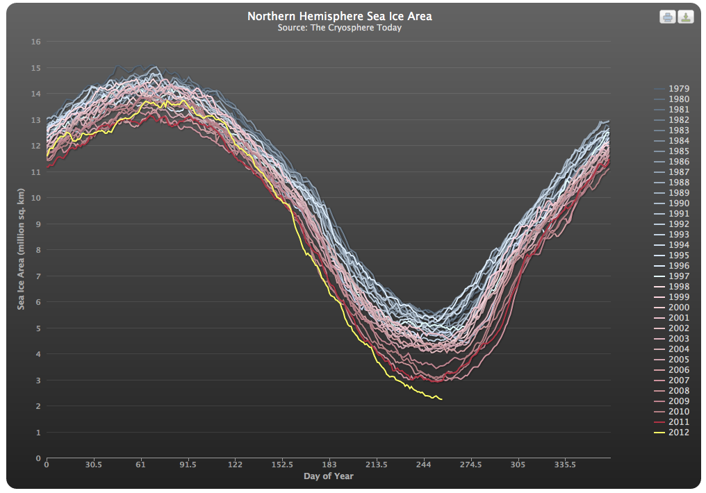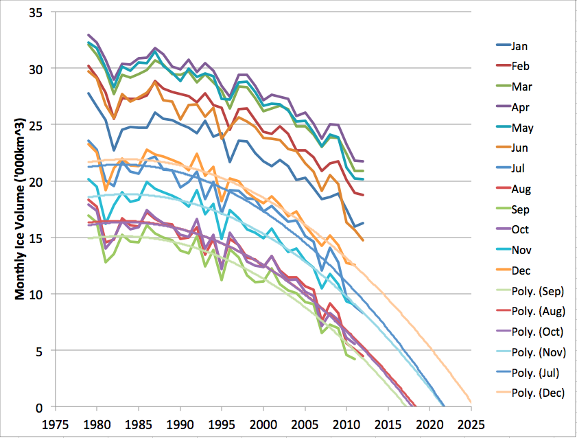 каждый цвет - месяц по годам. ордината - объём льда. + наглядная картинка под катом.