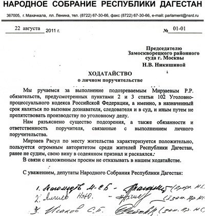 Во-вторых, Мирзаев всё время следствия находился в СИЗО. Это что не сидение? Если поинтересуетесь то в подобных ситуациях как правило обвиняемый находится под подпиской о невыезде.