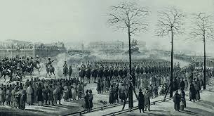 "Восста́ние декабристов — попытка государственного переворота, состоявшаяся в Петербурге, столицеРоссийской империи, <abbr title="по юлианскому календарю">14</abbr> (26) декабря 1825 года. Восстание было организовано группой дворян-единомышленников, многие из них были офицерами гвардии. Они попытались использовать гвардейские части для недопущения вступления на трон Николая I. Целью заговорщиков было упразднение самодержавия и отмена крепостного права. Восстание разительно отличалось от заговоровэпохи дворцовых переворотов по своим целям и имело сильнейший резонанс в российском обществе, значительно повлиявший на общественно-политическую жизнь последовавшей за ним эпохи правления Николая I." Wiki