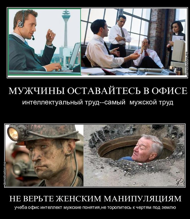 и они этими манипулируют мужским сознанием,что бы мужины комплексовали"ах,я работаю в офисе,женщинам не нравится..ах,ах,пойду ка в шахту ,на лесопавал,ведь женщины -гуру сказали на форуме мол это мужское дело