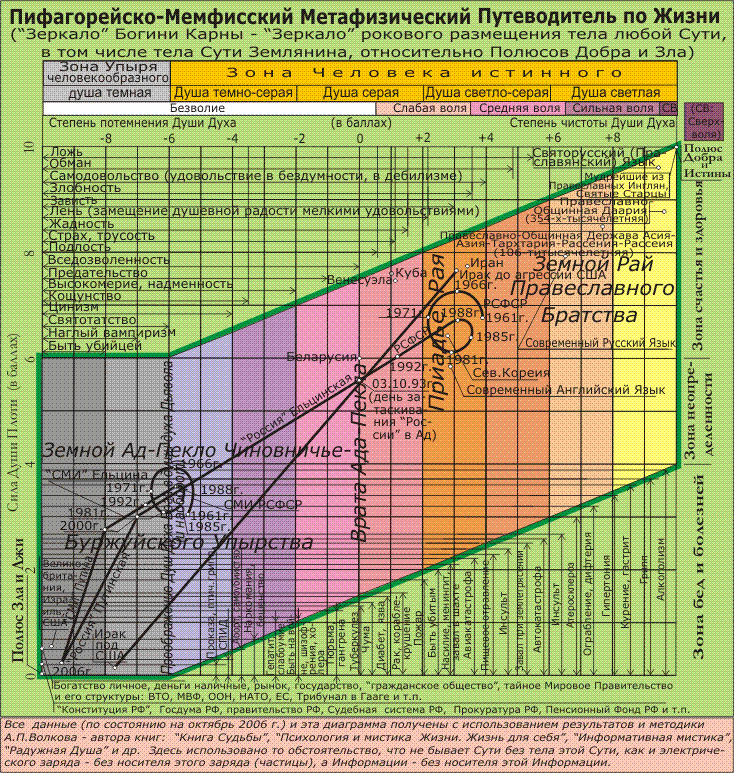 На Биоинформационной диаграмме, по координатным осям которой отложены положения информативных барьеров Биотестов А.П.Волкова качеств Души Землян (степени чистоты Души Духа или её потемнения) и степени здоровья(силы Души Плоти), можно представить всё многообразие Судеб Землян и проследить, в частности, траекторию степени омерзения главарей торжествующей Жидобанды в нашей Стране за период с 1991 года по 2006 год.