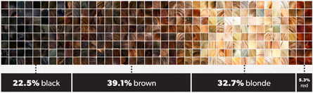 Опять-таки вопреки стереотипам не так много блондинок: большая часть шатенки – 39,1 %, потом блондинки – 32,7%, брюнетки – 22,5%, а рыжих только 5,3%. Если сложить темненьких и совсем темненьких, то получится, что их в два раза больше светленьких.