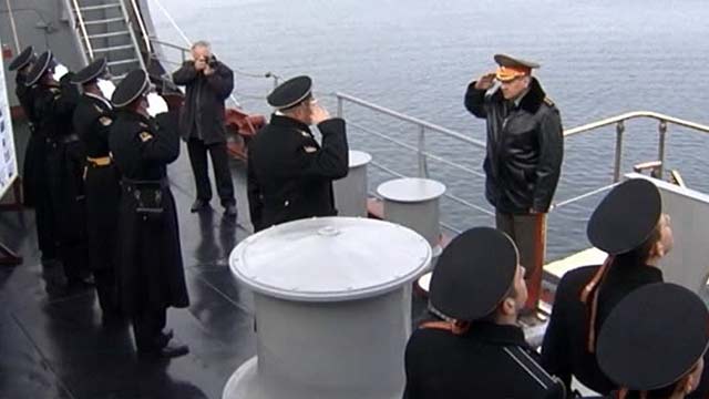 После этого Сергей Шойгу поднялся на борт флагмана Черноморского флота — крейсера «Москва». Четырнадцать офицеров, мичманов и старшин экипажа получили из рук Сергея Шойгу государственные награды за участие в недавних межфлотских учениях в Средиземном море.