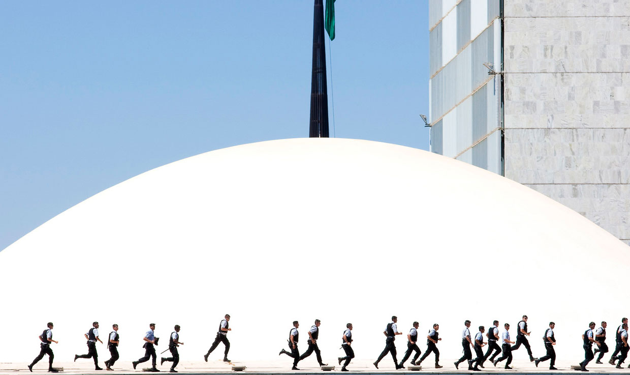 Полицейские на фоне здания Национального конгресса в Бразилии. Готовятся к демонстрации против коррупции. (Фото Olivier Boels):