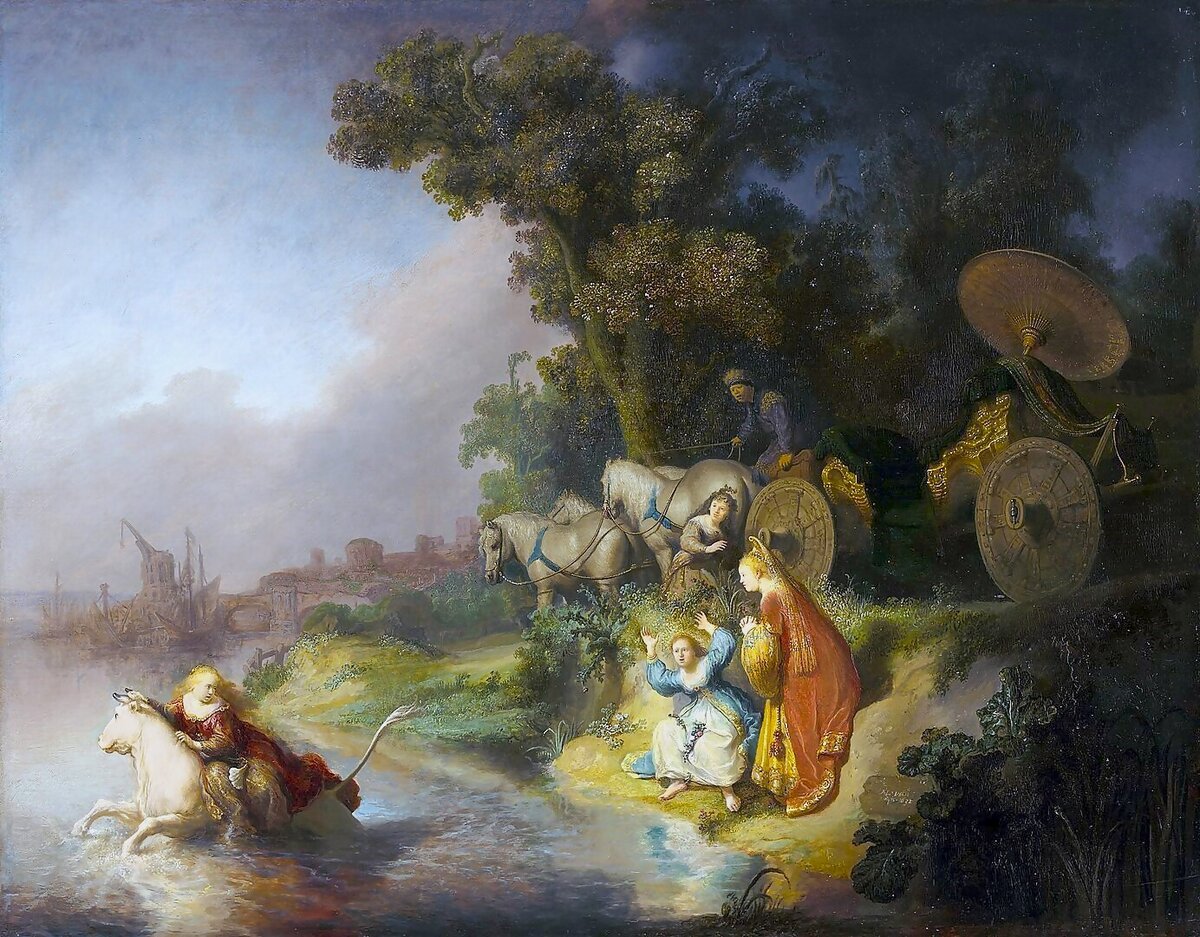 Обратите внимание на пальцы девушки, вцепившиеся в бычью шею. На зрительный контакт со слугами, оставшимися позади. Как много в этом взгляде! Смирение и ужас, растерянность и понимание — в пропорции, которой веришь. Миф превращается в трагический сюжет, он обретает смысл, и значит — жизнь. А как богат на вариации мазок! Ему подвластно было создавать текстуры шелка и парчи, мерцающих небес и смутных отражений, растительности самых разных типов, кожи, дерева, воды. И у всего — своя температура, податливость, объём и вес.