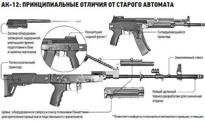 ===============Самое заметное направление развития автомата — универсальность. В конструкцию АК-12 интегрированы планки Пикатинни для установки дополнительного оборудования: оптических, ночных и коллиматорных прицелов, дальномеров, подствольных гранатометов, тактических фонарей, целеуказателей. Дульное устройство адаптировано для стрельбы ствольными гранатами, в том числе зарубежного производства. Это наводит на мысль о приоритетной ориентации на экспорт. В то же время автомат полностью соответствует современным требованиям Минобороны РФ, и руководство «Ижмаша» выразило готовность выполнить госзаказ в любом объеме. МВД уже запросило новый АК‑12 в опытную эксплуатацию.