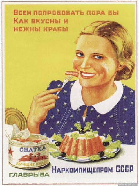 Приведенный ниже плакат относится к довоенной поре, но банки с крабами были во всех советских магазинах и в пятидесятые годы.