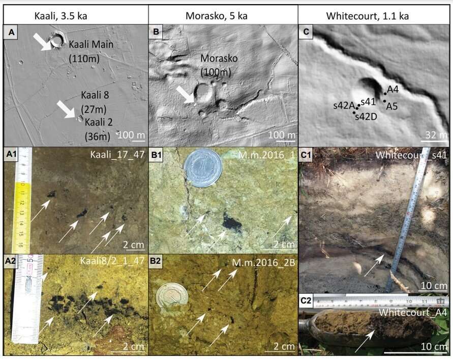 Международная группа исследователей выкопала траншеи в краях четырех кратеров (2 кратера Каали в Эстонии, Мораско в Польше и Уайткорт в Альберте, Канада), расположенных на двух разных континентах. Ученые отметили, что во всех этих местах были обнаружены кусочки древесного угля размером от миллиметра до сантиметра.