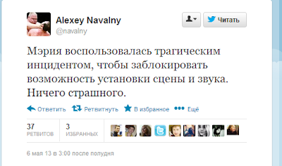 Некто Максим Мелков из Дмитрова, 25 или 26 лет от роду, монтировал конструкции сцены на Болотной. Хреново привинченная им же самим колонка упала на него и убила насмерть. Креативные оппозиционеры, разумеется, креативно почтили память погибшего - "Митинг на Болотной площади из-за гибели рабочего пройдет в усеченном формате", заявил один из организаторов акции Петр Царьков. Ну да, теперь можно легко объяснить, почему собралось мало народу - "митинг прошел в усеченном формате из-за гибели рабочего". Ага.