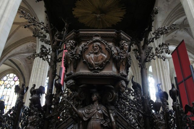 А эта кафедра украшает собор Evreux Cathedral в Нормандии, датируется 1675 годом: