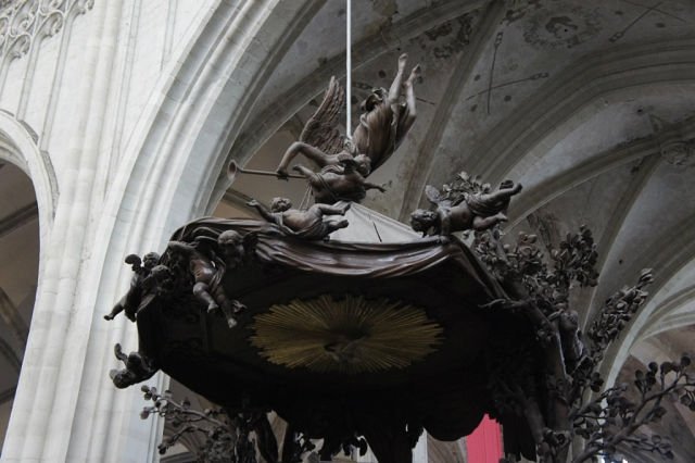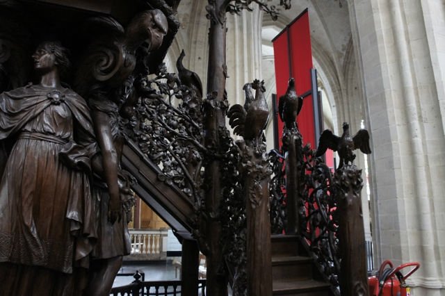 В Соборе Антверпенской богоматери меня поразила деревянная кафедра,созданная в пышном барочном стиле изготовленая скульптором Ван дер Воортом в 1713 году. Её украшала обильная резьба: деревья, птицы, многочисленные фигуры, орнамент.