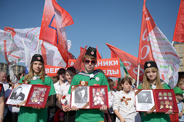 | На акцию на Поклонной горе пришли молодые москвичи с портретами своих славных предков. Фото: РИА "Новости" |