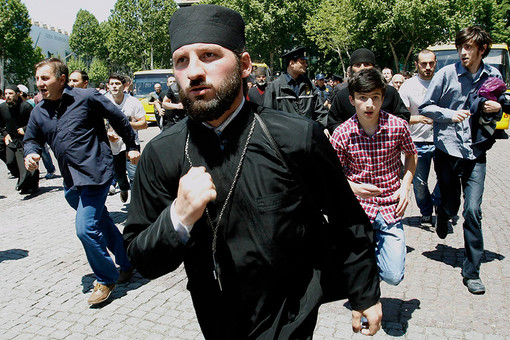 /Впрочем, не только на Украине всё так плохо. С утратой Саакашвили реальной власти, положение ненормальный в Грузии осложнилось тоже. Им разрешили сегодня провести свой парад в Тбилиси. Неудачно. Около 12 тысяч горожан прорвали полицейское оцепление и избили немногочисленных "нетрадиционалов". В итоге полиция погрузила их в автобусы и эвакуировала подальше от разъяренной толпы нормальных грузин. На фото - как раз их сегодня бьют. Порадовали и православные попы, возглавляющие атаку/.